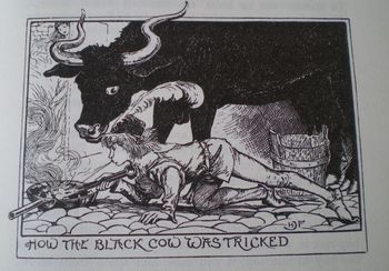 ”Oh, nulla,” rispose lui; “sto solo scaldando un paio di tenaglie nel caso tu non abbia voglia di darmi tutto il latte che voglio.” La mucca fece un profondo sospiro e guardò impaurita il mungitore, ma lui fece finta di nulla e munse rapidamente il latte nel secchio fino a prosciugare la mucca. Proprio in quel momento il vecchio entrò nella stalla e sedette a mungere lui stesso la mucca, ma non poté ricavarne una goccia di latte. “Hai davvero fatto tutto da solo o ti ha aiutato qualcuno?” ”Non mi ha aiutato nessuno,” rispose il principe, “all’infuori della mia povera testa.” Il vecchio si alzò dallo sgabello e se ne andò. Quella sera, quando il principe andò dal padrone per sentire quale sarebbe stato il lavoro del giorno successivo, il vecchio disse: “ Nel prato ho un piccolo mucchio di fieno che deve essere messo a seccare. Domani dovrai ammucchiarlo tutto nella rimessa e, se ci tieni alla tua vita, fai bene attenzione a non lasciarne indietro il più piccolo filo.” Il principe fu molto contento di sentire che non aveva nulla di peggio da fare. ”Portare un mucchio di fieno non comporta grande abilità,” pensò, “e non mi darà problemi perché ce lo condurrà il cavallo. Certamente non risparmierò la vecchia nonna.” Di lì a poco la ragazza si avvicinò furtivamente a chiedergli che incarico avesse per il giorno seguente. Il giovane rise e disse: “Sembra che io debba imparare ogni genere di lavoro da fattoria. Domani dovrò portare un mucchio di fieno senza lasciarne un filo nel prato, e questo è il lavoro di un intero giorno!” ”Oh, creatura sfortunata!” gridò lei; “e come pensi di farlo. Se avessi tutti gli uomini del mondo ad aiutarti, non potresti portare via questo piccolo mucchio in una settimana. Nel momento in cui avrai gettato il fieno in cima, attecchirà di nuovo dal basso. Ascolta ciò che ti dico. Devi sgusciar fuori all’alba di domani e portar fuori il cavallo bianco e alcune robuste funi. Poi gettale sul mucchio di fieno, legale attorno ad esso e attacca il cavallo alle funi. Quando sarai pronto, salta sul mucchio di fieno e conta uno, due, tre. Il cavallo ti chiederà che cosa stai contando e tu devi rispondere con sicurezza ciò che ti sussurro io.” Così la ragazza gli sussurrò qualcosa all’orecchio e lasciò la stanza. Il principe si disse che non c’era di meglio da fare che andare a letto. Dormì saporitamente ed ancora quasi buio quando si alzò e si accinse a mettere in pratica le istruzioni che gli aveva dato la ragazza. Dapprima scelse alcune funi robuste, poi lo cavalcò fino al mucchio di fieno, che era composto di cinquanta carrettate cosicché a malapena lo si poteva definire ‘un po’’. Il principe fece tutto ciò che la ragazza gli aveva detto e quando alla fine fu seduto in cima al mucchio ed ebbe contato fino a venti, sentì il cavallo chiedere stupito: “Che stai contando lassù in cima, figlio mio?” ”Oh, nulla,” disse lui, “Mi sto trastullando contando i branchi di lupi nella foresta, ma ce ne sono così tanti che davvero non penso di farcela.” La parola ‘lupo’ gli era appena uscita di bocca che il cavallo bianco partì come il vento, cosicché in un battito di ciglia ebbero raggiunto la rimessa, trascinandosi dietro il mucchio di fieno. Il padrone ammutolì per la sorpresa quando giunse dopopranzo e scoprì che il lavoro del giorno del suo uomo era stato tutto fatto. ”Possibile che tu sia così abile?” chiese. “O qualcuno ti ha dato dei suggerimenti?” ”Oh, ho solo la mia testa alla quale chiedere consiglio.” Disse il principe, e il vecchio andò via scuotendo la testa. In serata il principe andò dal padrone per sapere che cosa avrebbe dovuto fare il giorno seguente. Il vecchio disse: “Domani dovrai condurre nel prato il vitello dalla testa bianca e, se ci tieni alla tua vita, bada bene di non lasciartelo scappare.” Il principe non rispose nulla, ma pensò: “Più di diciannove contadini hanno sorvegliato una mandria intera, di certo io potrò governarne uno.” E andò verso la stanza, in cui lo aspettava la ragazza. ”Domani ho un lavoro da stupidi,” disse, “Non devo far altro che condurre nel prato il vitello dalla testa bianca.” ”Oh, creatura sfortunata!” gemette lei, “Non sai che quel vitello è così veloce che in un solo giorno può fare per tre volte il giro del mondo? Fai attenzione a ciò che ti dico. Lega l’estremità di questo filo di seta alla zampa anteriore sinistra del vitello e l’altra estremità al mignolo del tuo piede sinistro, cosicché il vitello non possa mai lasciare il tuo fianco, sia che tu cammini, stia fermo o ti sdrai.” Dopodiché il principe andò a letto e dormì saporitamente. Il mattino seguente fece esattamente ciò che gli aveva detto la ragazza e condusse il vitello con il filo di seta nel prato, dove se ne stette al suo fianco come un cane fedele. Al tramonto, lo stava riportando nella stalla quando venne il padrone e disse, con la fronte aggrottata: “Davvero sei così abile o qualcuno ti ha detto che cosa fare?” ”Oh, ho solo la mia povera testa,” rispose il principe, e il vecchio se ne andò borbottando: “Non credo a una sola parola! Sono certo che hai trovato un amico astuto!” La sera chiamò il principe e disse: “Domani non ho nessun lavoro per te, ma quando mi sveglierò, dovrai venire davanti al mio letto e darmi la mano in segno di saluto.” Il giovane si stupì di questo strano capriccio e, ridendo, andò in cerca della ragazza. ”Ah, non c’è niente da ridere,” gemette la ragazza. “Ha intenzione di mangiarti e posso aiutarti in un solo modo. Devi arroventare un badile di ferro e porgerglielo invece della mano.” Così il mattino seguente si svegliò assai presto e arroventò il badile prima che il vecchio si svegliasse. Finalmente si sentì chiamare. “Lazzarone, dove sei? Vieni a darmi il buongiorno.” Ma quando il principe entrò con il badile rovente, il padrone dis